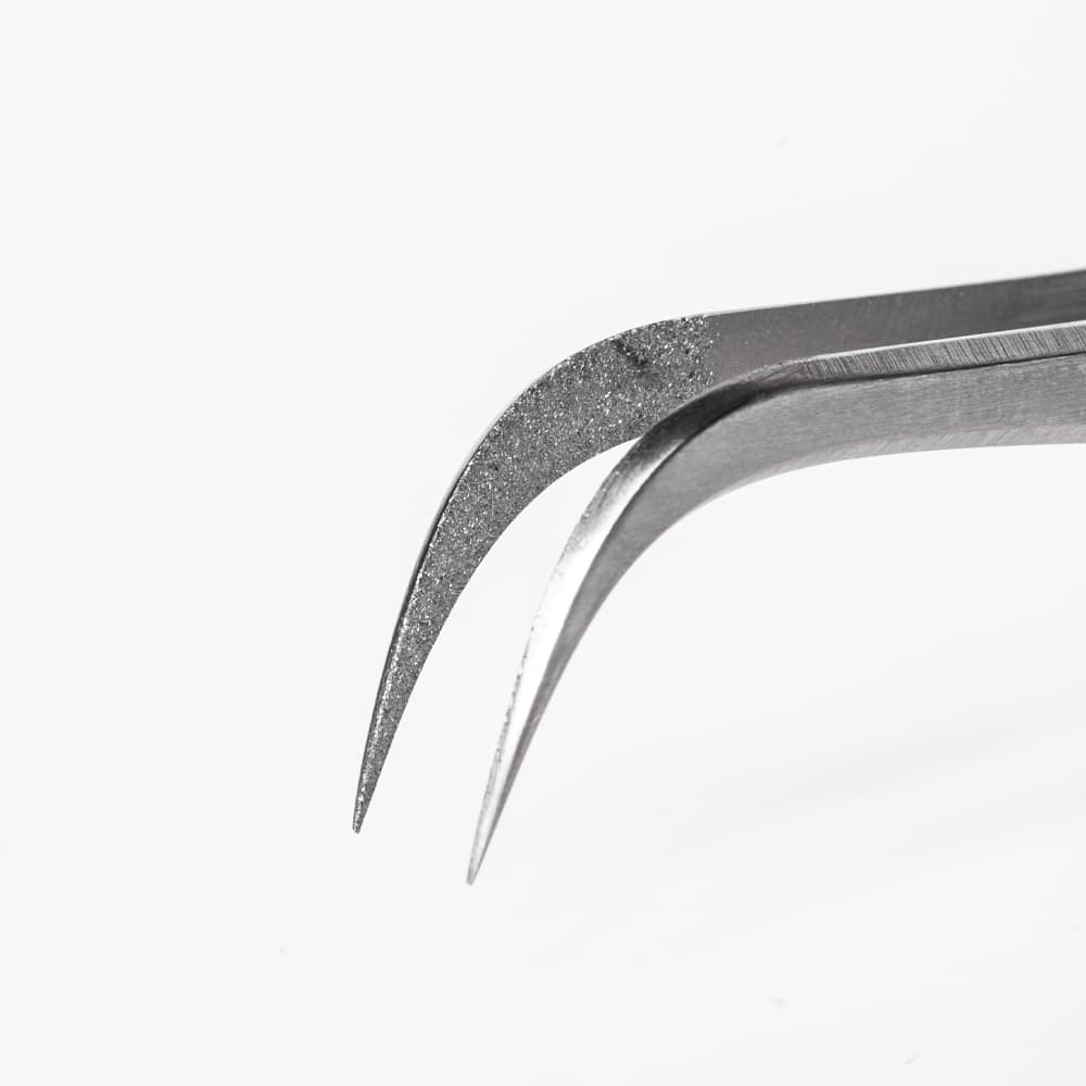 Dank der speziellen Diamantbeschichtung kann die Pinzette mehr Wimpern greifen als reguläre Volumenpinzetten.